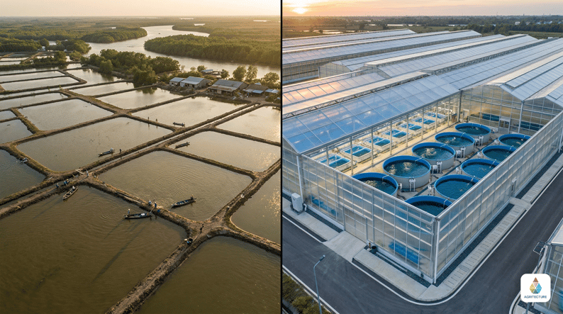 Image 2: Traditional pond shrimp farming (left) vs. a controlled indoor system (right). The contrast in footprint and environmental exposure is stark.