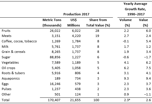 Crop mix is changing. A 2019 analysis in Choices Magazine reported that Caribbean and Central American countries produced roughly 170 million tonnes of raw food and fiber worth US$21.65 billion in 2017. Traditional crops such as sugar, bananas, coffee, cocoa and tobacco still occupy large acreage, but their share of value has stagnated. Tropical fruits like pineapple, mango, papaya, avocado and guava surged from 12 % to 28 % of total value over two decades. Pineapple production now surpasses bananas in value, with leaders including Costa Rica and the Dominican Republic. Vegetables (tomatoes, peppers, onions) and oil crops also expanded, reflecting a growing regional and international demand.